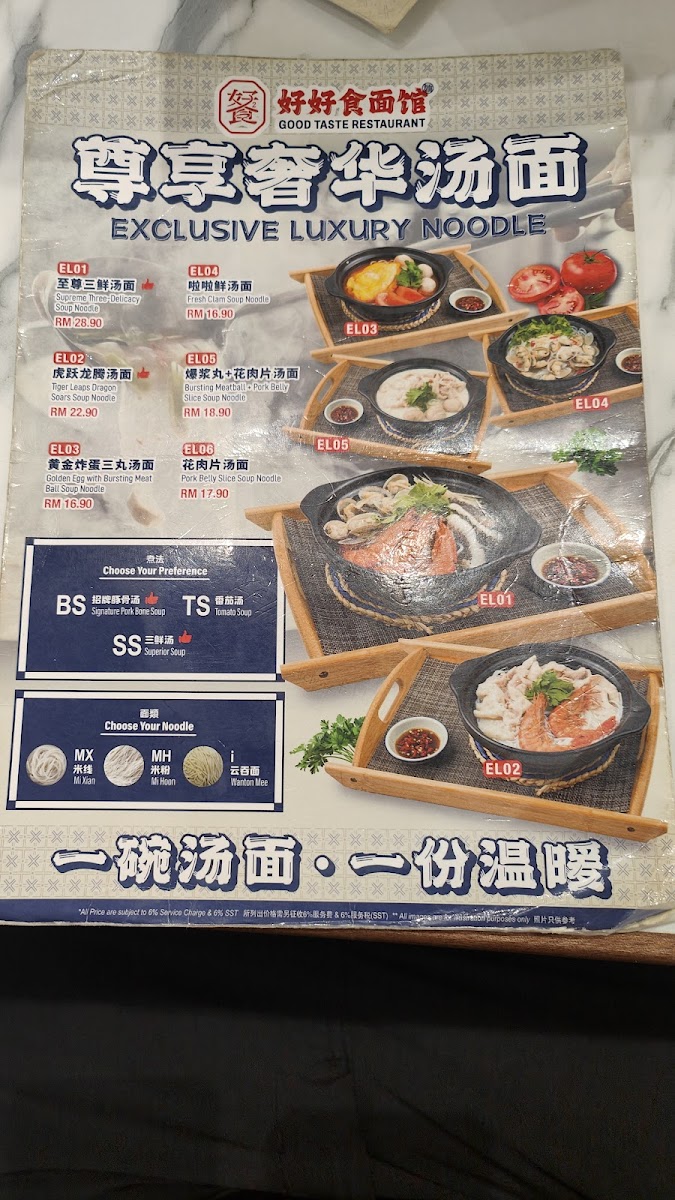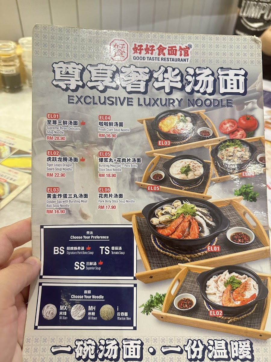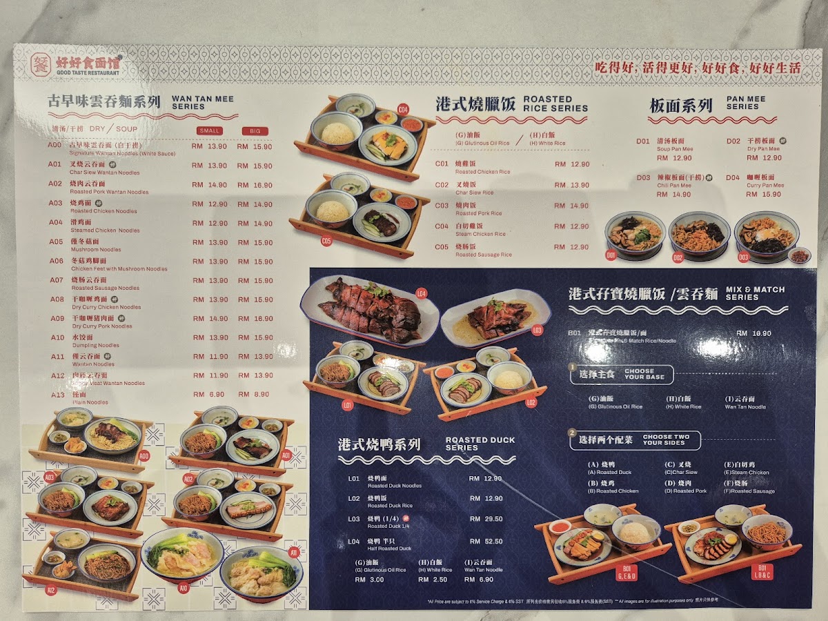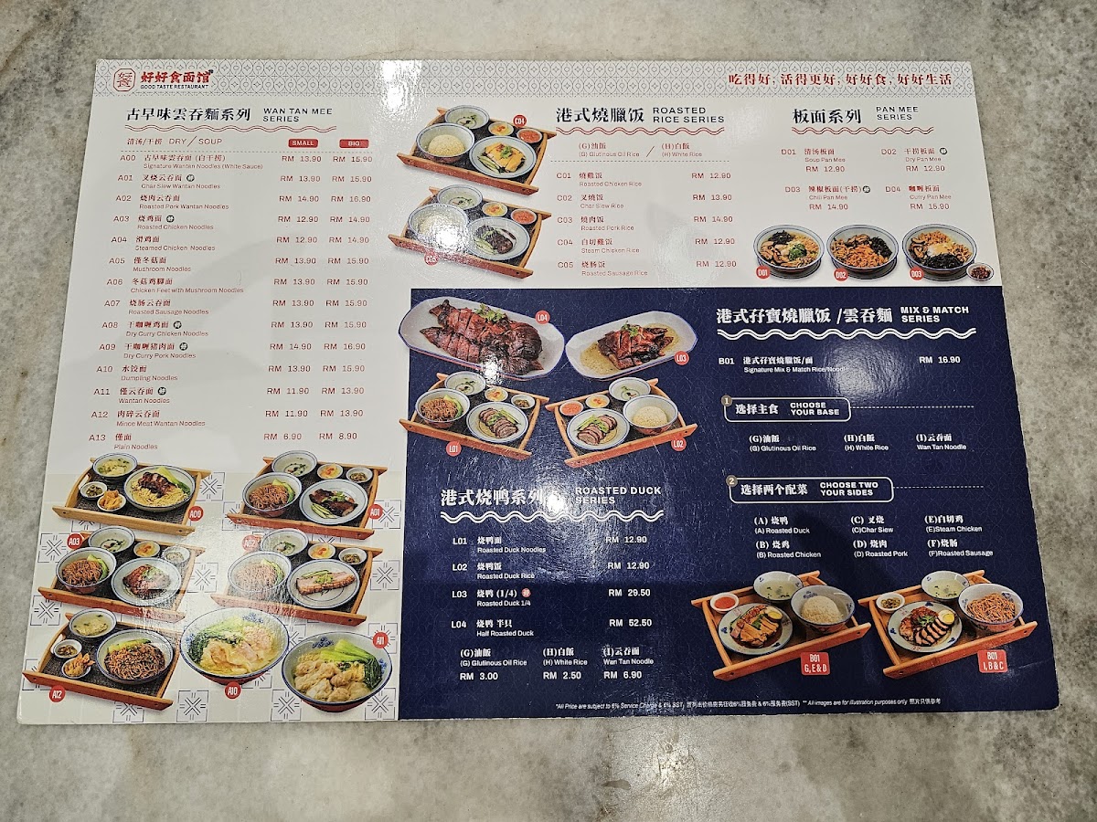 The menu at Restoran Good Taste Jalil Link features a variety of traditional Chinese noodle dishes alongside a selection of rice, porridge, and light bites, suitable for casual dining any time of the day. Visitors can expect a range of options structured into distinct groups reflecting different meal preferences and flavors.
